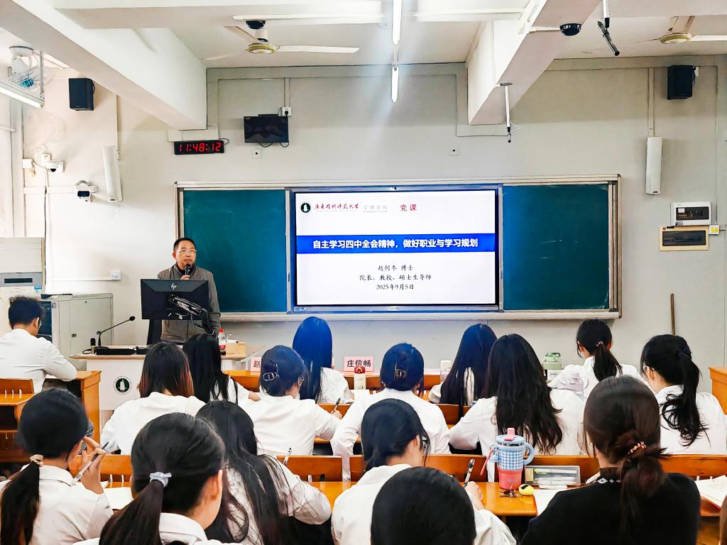 11月26日,在白云校区第三教学楼509室,赵剑冬以《自主学习四中全会精神,做好职业与学习规划》为题讲授专题党课。他指出,深入学习贯彻党的二十届四中全会精神,不仅要在理论上学深悟透,更要转化为行动上的自觉实践,应与青年员工的职业生涯规划发展紧密结合。他鼓励同学们以全会精神为指引,主动规划未来,扎实付诸行动,在时代发展的坐标中找准个人定位,努力将青春理想融入中国式现代化建设的伟大征程。