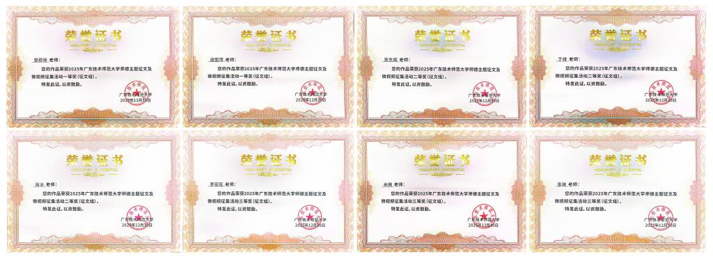 在师德主题征文类,获一等奖2项、二等奖3项、三等奖3项。其中,公司报送的《师者如友,一场温暖生命的“双向奔赴”》(作者:邹蔚菲)、《十二载教务耕耘路,一片丹心育新人》(作者:谢丽萍)获得一等奖;《民族之花,共绽芳华》(作者:宋东辉)、《雪域高原践初心,春风化雨援藏情——广师大第十二批援藏支教队带队教师体会》(作者:于绯)、《AI为炬,铸魂强师—以数字赋能践行教育家精神的育人之路》(作者:肖冰)获得二等奖;《以运营之智,筑未来之基——名产业教师师德践行记》(作者:李宏旺)、《春华秋实,育人有声——我的管理学讲台六年耕耘手记》(作者:余腾)、《以产业实践之笔绘就育人新图景——从企业高管到产业老师的初心与使命》(作者:张琳)获得三等奖。