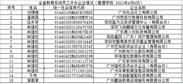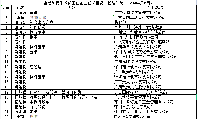 根据《伟德国际victor1946教师校外兼职管理办法(试行)》(广师大党委[2022 ]38号)规定,根据相关单位提供线索及老师的自查,现将相关老师在外开设企业及兼职的情况公示如下,公示时间自2023年4月7日至11日,如有异议及建议,请向公司党政办公室实名反映。