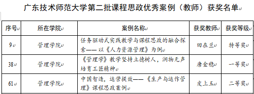 根据《关于开展公司第二批本科“课程思政”优秀案例推荐暨评选活动的通知》要求,经教师申报、各单位推荐、公司审核、校外专家评审,公司获评3个优秀案例,其中人力资源管理系田在兰老师申报的“任务驱动式实践教学与课程思政的融合探索——以《人力资源管理》为例”教学案例荣获特等奖,旅游管理系唐金稳老师申报的“《管理学》教学坚持立德树人,润物无声培育工匠精神”教学案例获得一等奖,工商管理系皮上玉老师申报的“中国智造,运营提效——《生产与运作管理》课程思政案例”获得二等奖。