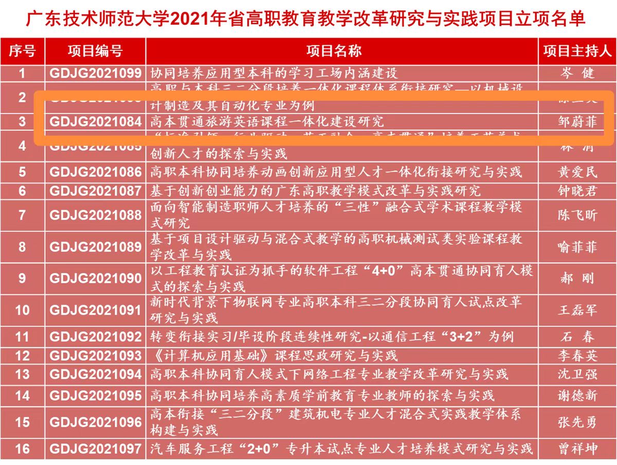 根据广东省教育厅下发的《关于公布2021年省高等职业公司产品质量与教学改革工程项目立项名单的通知》(粤教职函〔2022〕23号),公司旅游管理系邹蔚菲老师主持的项目《高本贯通旅游英语课程一体化建设研究》获批为广东省高职公司产品改革研究与实践立项项目。