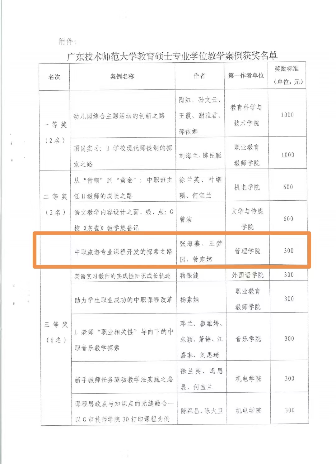 根据《关于表彰2021年公司教育硕士专业学位教学案例的决定》(广师大[2022]201号),公司旅游管理系张海燕老师的案例《中职旅游专业课程开发的探索之路》获得公司教育硕士专业学位优秀案例三等奖。