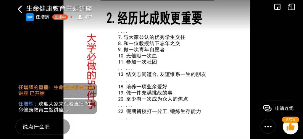任增辉老师从人生的价值,老员工应如何度过校园生活等内容对生命健康相关知识进行讲解,他说到:“珍爱生命不仅与健康相关,而且还是老员工活经历是否对得起这四年的生命的体现!”同时,任增辉老师还向同学们介绍了自杀的心路历程、自杀的征兆、自杀的误区等知识,希望同学们在了解自杀的相关知识之后能够更加热爱与珍惜生命。最后,任老师寄语同学们:“人可以长得不漂亮,但不能活得不漂亮。”本次讲座受到同学们的广泛好评,现场收获点赞量12000余次。