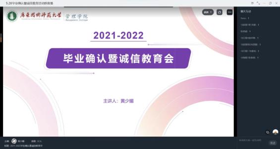 为深入推进资助育人活动与诚信教育紧密结合,伟德国际1946亚洲版助学服务中心于2022年5月28日通过线上直播的方式举行以“诚信还款,锦绣前程”为主题的毕业确认暨诚信教育活动,帮助贷款毕业生了解贷款相关事宜,提升诚信意识。会议由助学助理黄少媚主持,辅导员彭静老师出席,参会人数共54人。