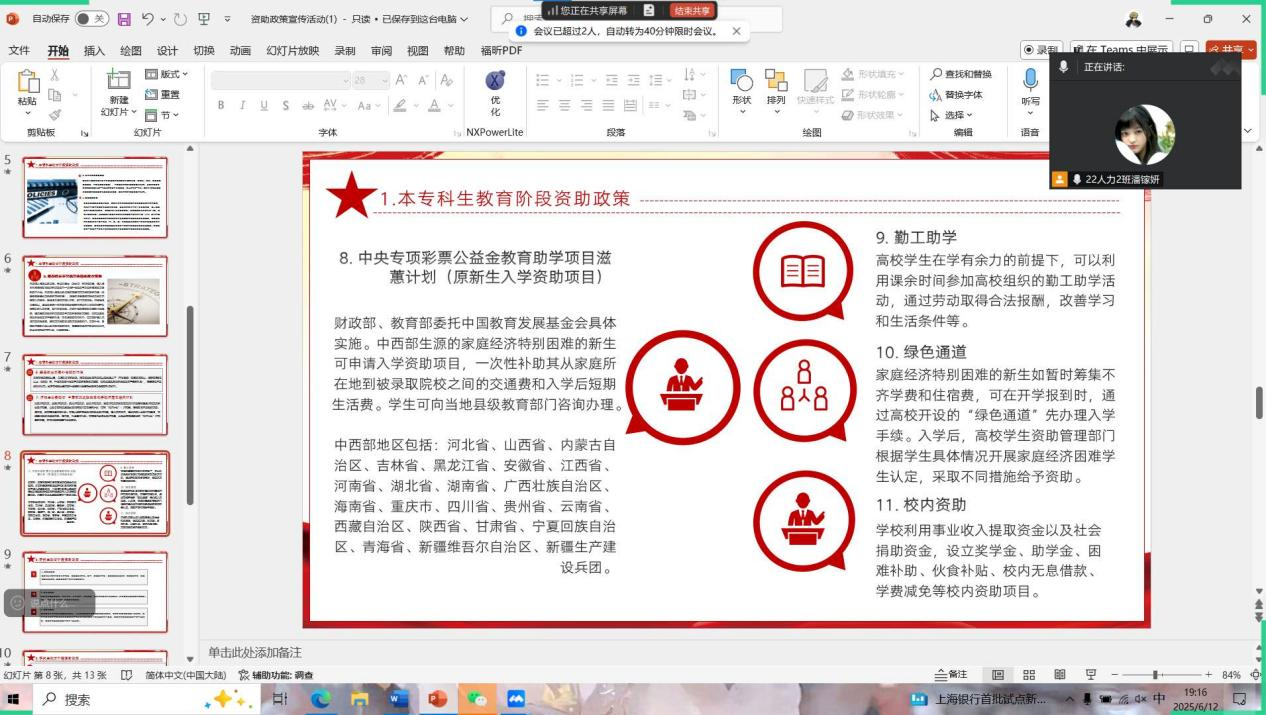 线下宣讲以沉浸式政策解读触达班级,各班级组织开展主题班会,副班以PPT演示、案例剖析两重形式讲解资助政策,重点拆解国家助学贷款、奖助学金申请等政策的“申请条件、材料清单、时间节点”等,并进行防诈骗提醒。