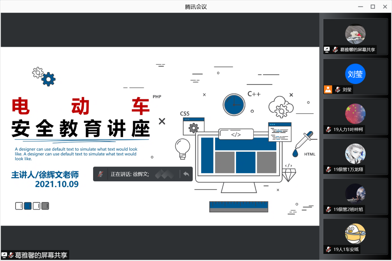 徐辉文老师结合近期广东部分高校电动车使用出现事故的例子,要求使用电动车的同学高度重视电动车的安全、规范使用,遵守公司规定,安全驾驶。同时,针对19级骑电动车同学可能会出现的风险作出了如下具体要求:不允许新增购买电动车;禁止驾驶电动车三无产品;不允许在宿舍内充电。本次会议目的在于提高同学们电动车使用隐患意识和安全防范意识,规范使用电动车,共创安全校园环境。