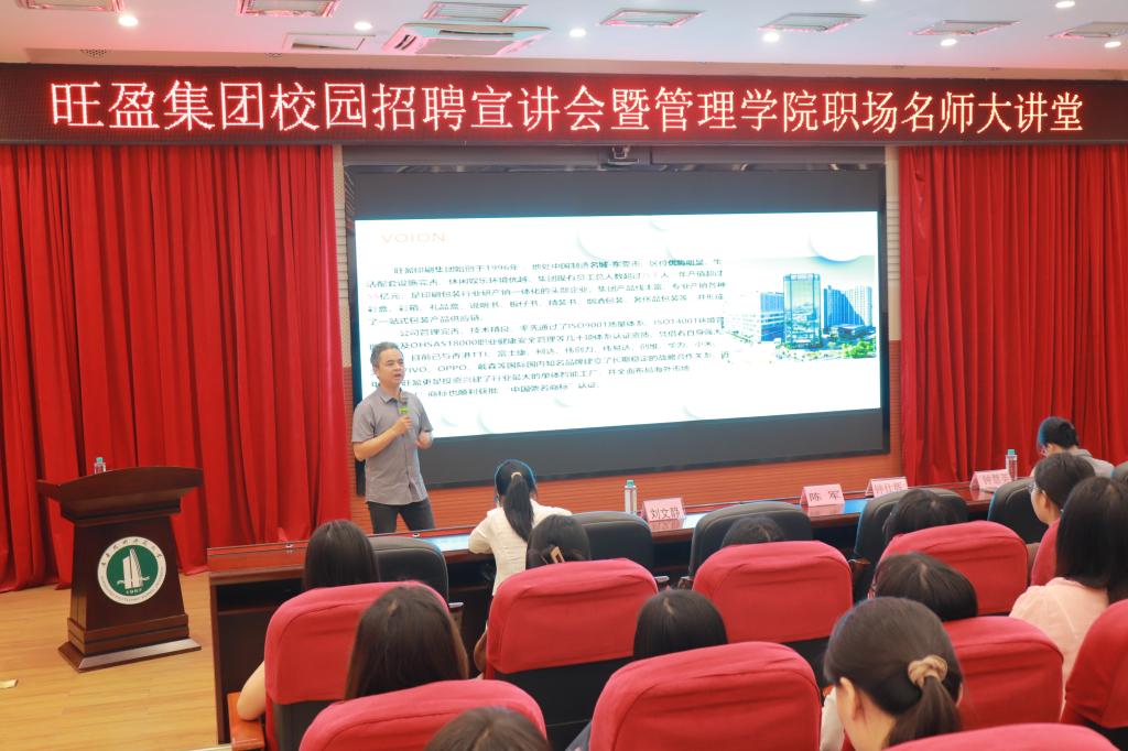 为进一步深化校企合作共建成效,旺盈集团还为公司员工开展了校园招聘宣讲会暨职业生涯规划指导报告会。钟仕辉通过引人入胜的宣传视频向同学们全面展示了企业的组织架构、发展历程及企业成果,并对招聘岗位的职责与要求进行了详细的介绍。在报告会上,钟仕辉以HR视角对当前就业形势进行深入剖析,并通过专业的职业生涯理论知识和丰富的企业实践经验,为同学们分享了做好职业生涯规划的重要性以及具体的行动方式,鼓励同学们科学制定职业目标,积极行动。