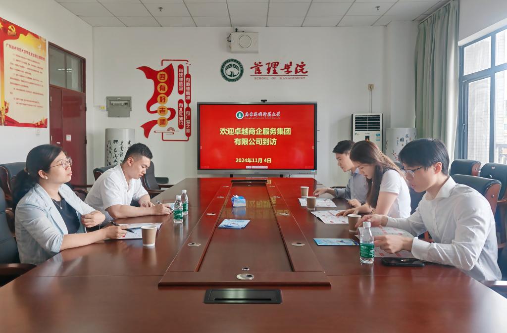 会议伊始,许素美对卓越商企服务集团有限公司招聘团队一行的来访表示热烈欢迎,重点介绍了公司发展历程、人才培养特色及用人单位对公司毕业生满意度等情况。紧接着,庄信畅进一步就公司学科优势、2025届毕业生的求职意向、实习进展等方面进行了详细分析,希望双方能够借此契机,开展深入交流,拓宽合作空间。