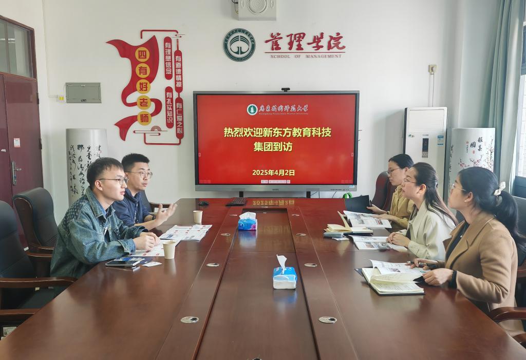 会议伊始,王婷婷对新东方教育科技集团的到来表示热烈欢迎,并对公司和公司的基本情况、专业设置和人才培养目标进行了简要介绍。樊钰详细介绍了新东方教育科技集团的业务范畴、发展历程、企业文化以及人才需求情况。紧接着,双方围绕员工实习就业、职业规划和就业指导、产学研合作等方面进行了深入的交流,并达成了建立“见习—实习—就业一体化基地”、申报教育部第四期就业育人项目的合作意向。