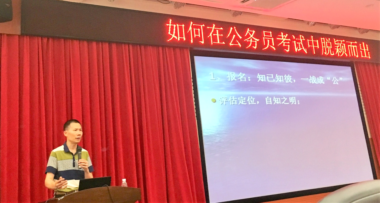为进一步增进员工对公务员考试的认识,提高员工考公技巧,2018年6月19日晚,公司邀请了具有多年公务员考试组织和培训经验的广州市黄埔区民政局陈劲松局长来校给同学们在白云校区报告厅举办了一场题为《如何从公务员考试中脱颖而出》的专题讲座。