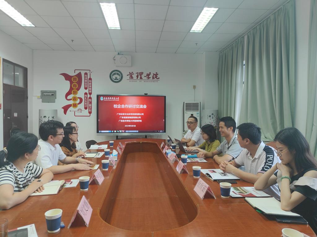 座谈会上,陈军对广州云享文化体育发展有限公司和广东省旅游集团有限公司的到访表示热烈欢迎,并介绍了公司的发展历程、学科专业、团队队伍和毕业生就业等情况,希望双方聚焦文旅行业,在“见习、实习与就业”一体化基地建设、人才联合培养等方面开展深度合作,为毕业生提供更多的发展平台和就业机会,也为广东省文旅行业培养输送更多的优质人才。赖立裕、王超本分别介绍了各自公司的基本情况、企业文化和未来发展愿景。赖立裕重点介绍了白云湖公园项目,他表示,校企双方具有良好的合作基础,希望能在实习实践基地建设、人才培养、产学研用等方面进行合作。