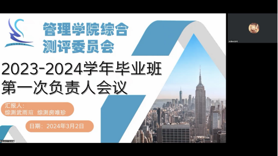 2024年3月2日晚上20点30分,伟德国际1946亚洲版综合测评委员会通过腾讯会议平台召开线上管院2023-2024学年毕业班第一次负责人会议,综合测评委员会指导老师杨晓霞受邀出席会议。