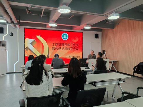 按照党章规定的预备党员转正程序,申请转正的预备党员周霖博士汇报了自己在预备期间的表现,介绍了个人教学和科研情况,以及担任专职辅导员组织完成员工综合测评及奖学金评选、邀请广州市白云区江高派出所警官给员工做反诈骗宣传等工作,并表明自己入党的态度和决心。工商管理系教工党支部书记赵剑冬教授和入党介绍人工商管理系主任邓芳介绍了周霖博士在预备期间思想、工作、生活等方面的表现。最后,经过支部大会进行讨论,与会党员充分发表意见,一致同意周霖博士按期转为正式党员。