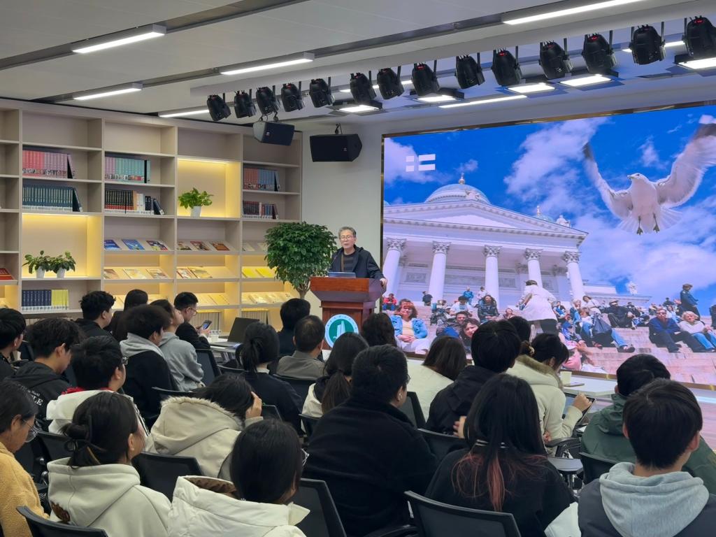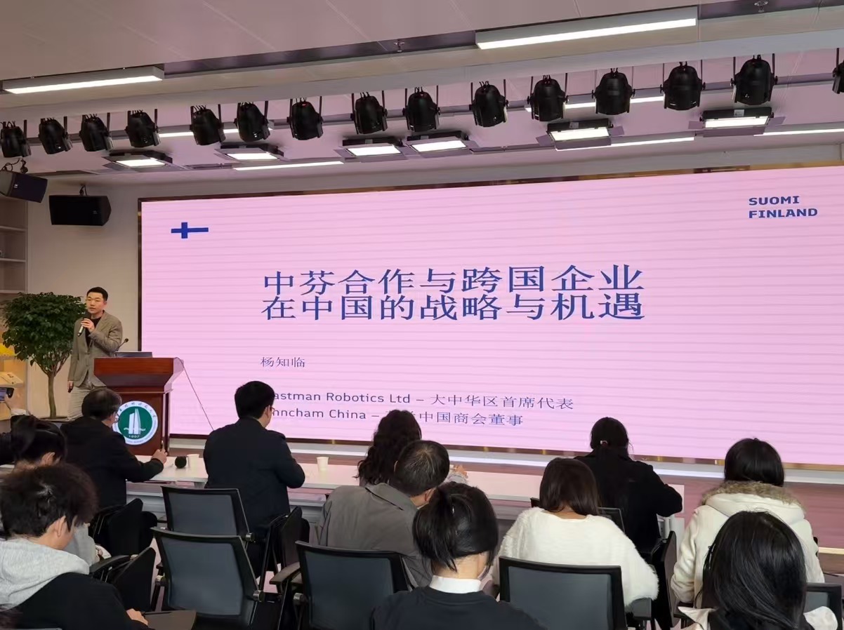 讲座上,杨知临结合自身留学背景和跨国企业的工作经历,介绍了芬兰的概况、风土人情、教育体系,以及中国和芬兰在教育与商业领域的合作实践与前景展望,并从国家发展战略考量、国际化人才培养趋势和员工升学就业需求三个方面,深入分享了加强中芬教育合作对深化国际化人才培养的重要意义。