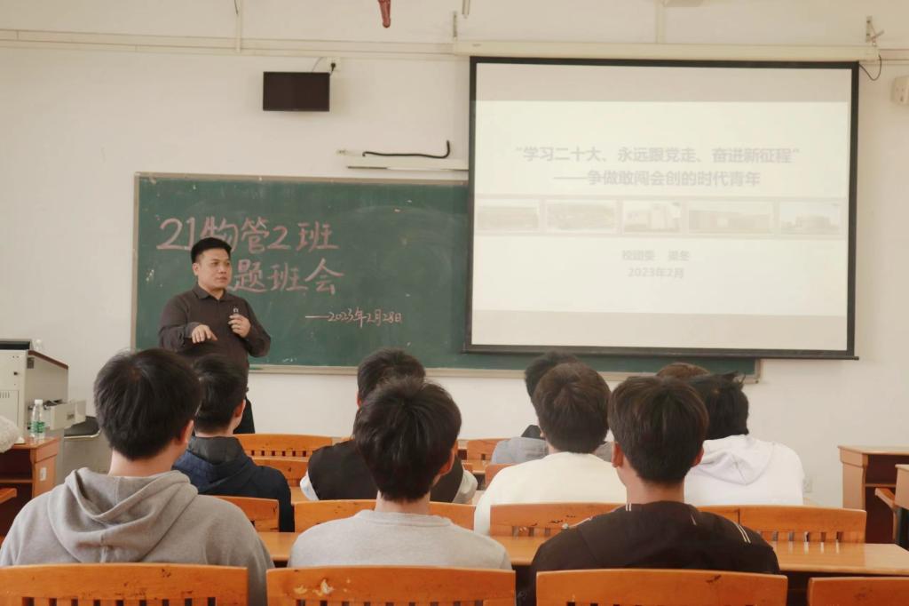 为深入学习贯彻党的二十大精神,教育引导员工坚定不移听党话、跟党走,提高员工创新创业素质和能力,激发员工树立正确的择业观和价值观,2023年2月28日下午3点伟德国际1946亚洲版21级物流管理2班在白云校区第二教学楼503室召开了“学习二十大,永远跟党走,奋进新征程”的主题班会。本次班会邀请公司团委副书记梁冬主讲,辅导员兰虹、21物流管理2班全体同学参加了此次会议。