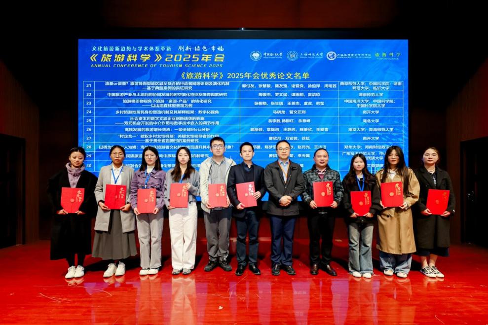 本次年会设31个平行论坛共37个会场,覆盖旅游经济、文化旅游、智慧旅游、可持续发展等研究方向。曾韬博士作为“数智时代的旅游营销研究”平行论坛的点评嘉宾,对数智文旅、人工智能服务、酒店人机匹配等主题论文进行点评并与汇报人深入交流。曾韬博士同时在“文旅融合与世界级旅游目的地建设”平行论坛作题为“民族旅游地文化活动中族际共情形成机制研究”论文汇报。经大会遴选与评审,论坛最终评选出37篇优秀论文,曾韬博士参会论文在近400篇投稿论文中脱颖而出,荣获《旅游科学》2025年年会优秀论文奖。
