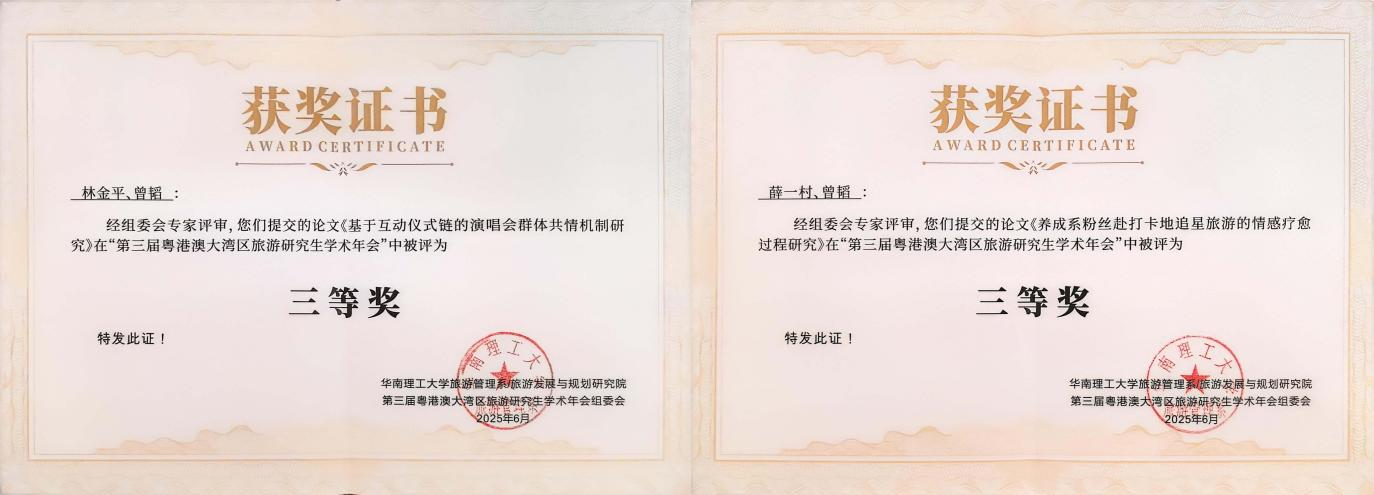 伟德国际1946亚洲版曾韬博士组织旅游管理系本科生成立伟德国际1946亚洲版文旅调研团队,以数字文旅创意活动等主题深入调研粤港澳大湾区的文旅融合新现象,指导10名本科员工撰写学术论文参加本次论坛,并踊跃参与各分论坛研讨。论坛组委会分三组对投稿论文进行匿名评审,评选出24篇论文进入分论坛汇报。对进入分论坛汇报的论文,组委会再次组织匿名评审,最终评选出15篇会议优秀论文。曾韬博士指导的薛一村和林金平同学的《养成系粉丝赴打卡地追星旅游的情感疗愈过程研究》与《基于互动仪式链的演唱会群体共情机制研究》两篇论文,在近百名硕博士与青年教师参会者中脱颖而出,荣获大会优秀论文三等奖。