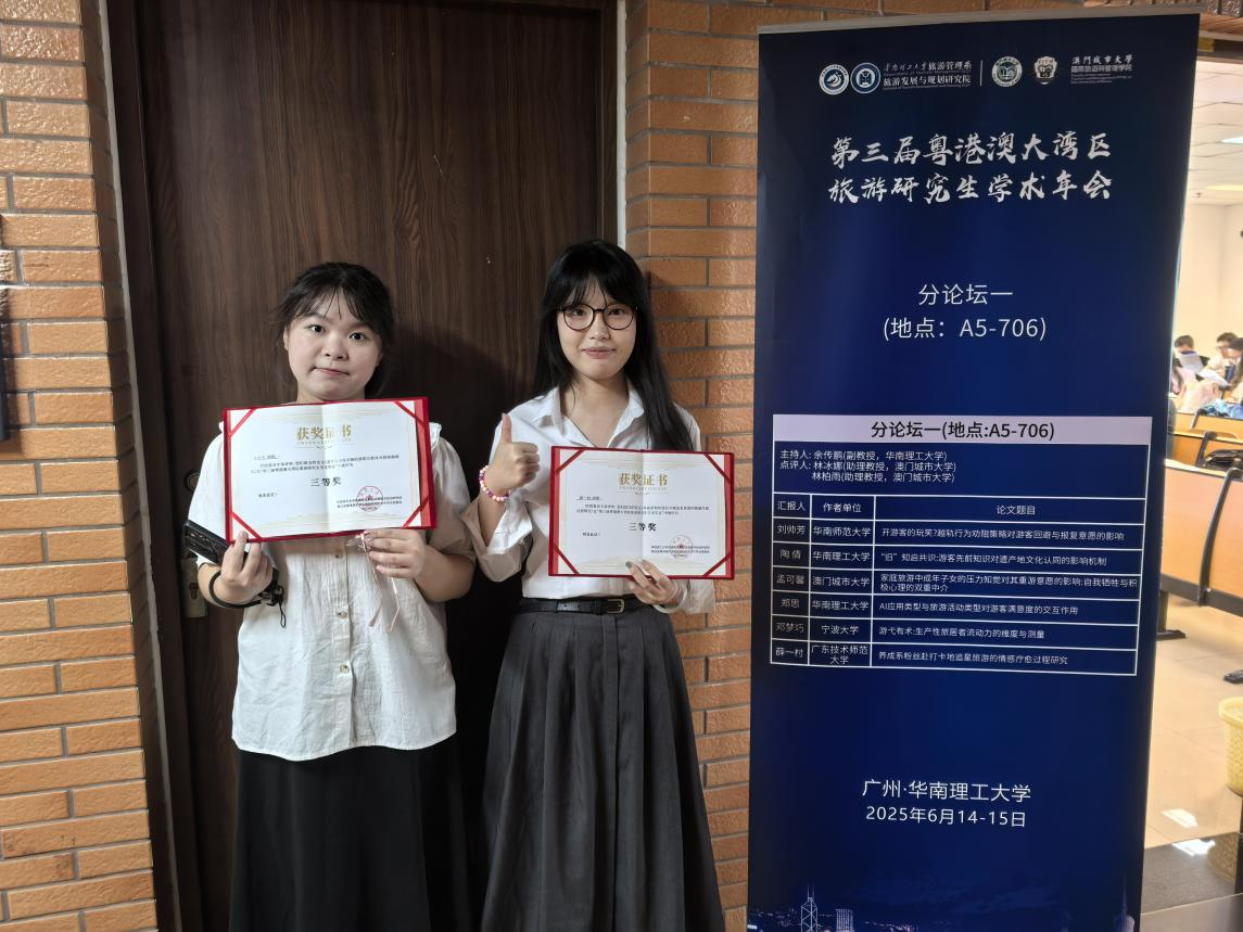 2025年6月14日-15日,由华南理工大公司联合澳门城市大学共同主办的第三届粤港澳大湾区旅游研究生学术年会顺利召开。会议以“青年学术共同体赋能湾区旅游新发展”为主题,中山大学、华南理工大学、澳门城市大学、南开大学、上海师范大学、华南师范大学、海南大学等来自全国20所高校与科研机构的近百名硕博士研究生与青年学者齐聚年会共同深入交流。