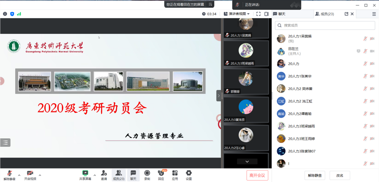为提高公司员工考研热情,充分调动员工考研积极性,帮助员工认清当前考研新形势,树立考研自信心,明确考研目标,营造良好的考研氛围,6月17日,人力资源管理系通过腾讯会议的形式面向2020级员工召开了考研动员会,会议由人力资源管理系主任田在兰老师主持。