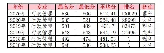 行政管理专业2018年以来招生人数、录取最低分、录取最低排位如下表所示。