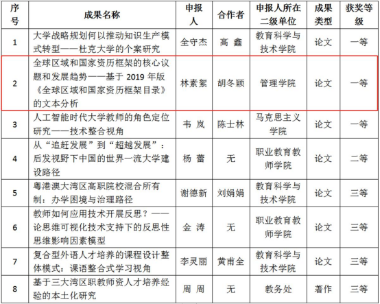 近日,广东省高等教育学会公布了《广东省高等教育学会第二届高等教育研究优秀成果奖拟获奖名单》,公司共有8项相关成果获奖,其中,公司林素絮老师主持申报的项目“全球区域和国家资历框架的核心议题和发展趋势——基于2019年版《全球区域和国家资历框架目录》的文本分析”获评高等教育研究优秀成果奖一等奖。