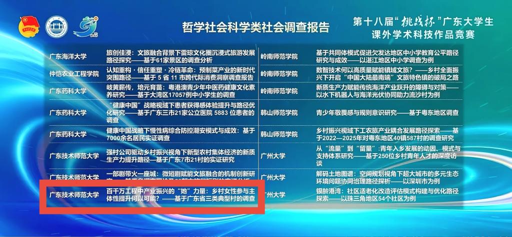 2025年5月19日,由团省委、省教育厅、省科学技术厅等共同主办的第十八届“挑战杯”广东老员工课外学术科技作品竞赛终审决赛在肇庆公司举行。其中,伟德国际1946亚洲版参赛作品——《百千万工程中产业振兴的“她”力量:乡村女性参与主体性提升何以可能?——基于广东省三类典型村的调查》(指导老师:阳程文、侯保疆、张艳清)在此次“挑战杯”决赛中荣获省级特等奖。